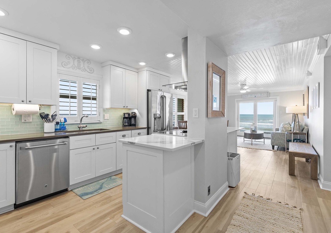 Step right out onto the sand from this beautifully decorated first-floor, direct oceanfront corner unit in beautiful New Smyrna Beach. This oceanfront condo offers the rare luxury of a private patio – perfect for morning coffee, afternoon lounging, or evening cocktails with the sound of the waves just steps away. Inside, you’ll find thoughtful details throughout – from custom finishes to upscale touches that make the space feel both luxurious and welcoming. The open-concept kitchen features sleek countertops and a coastal color palette, while the living area offers serene views and direct access to the patio.