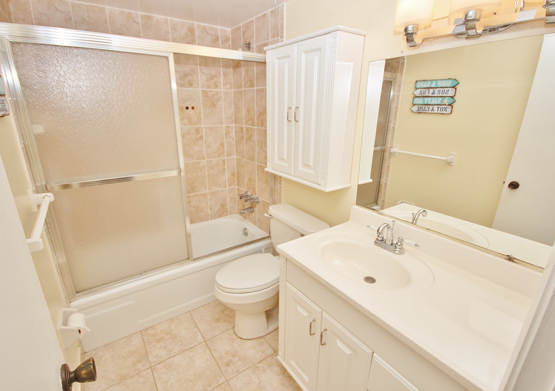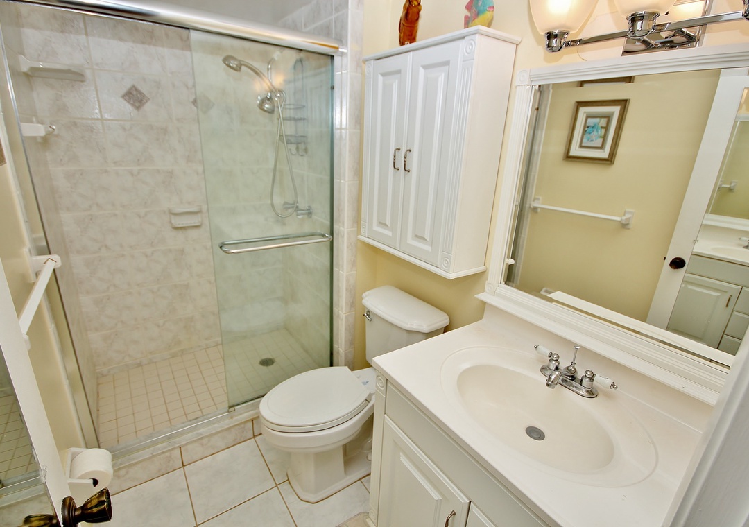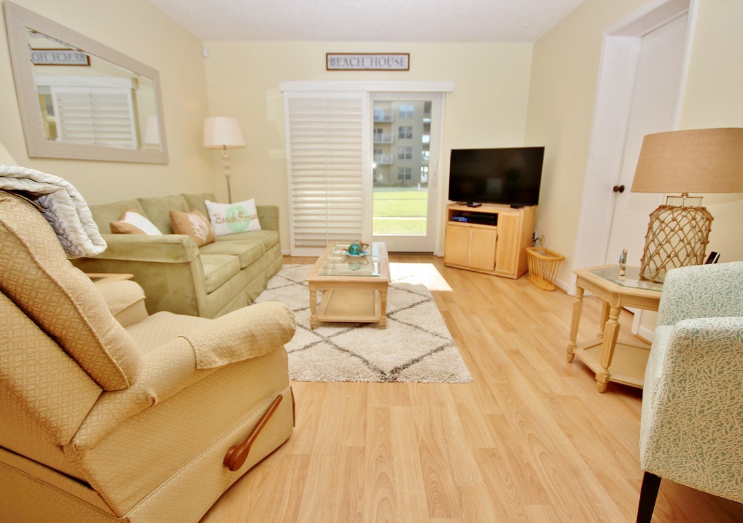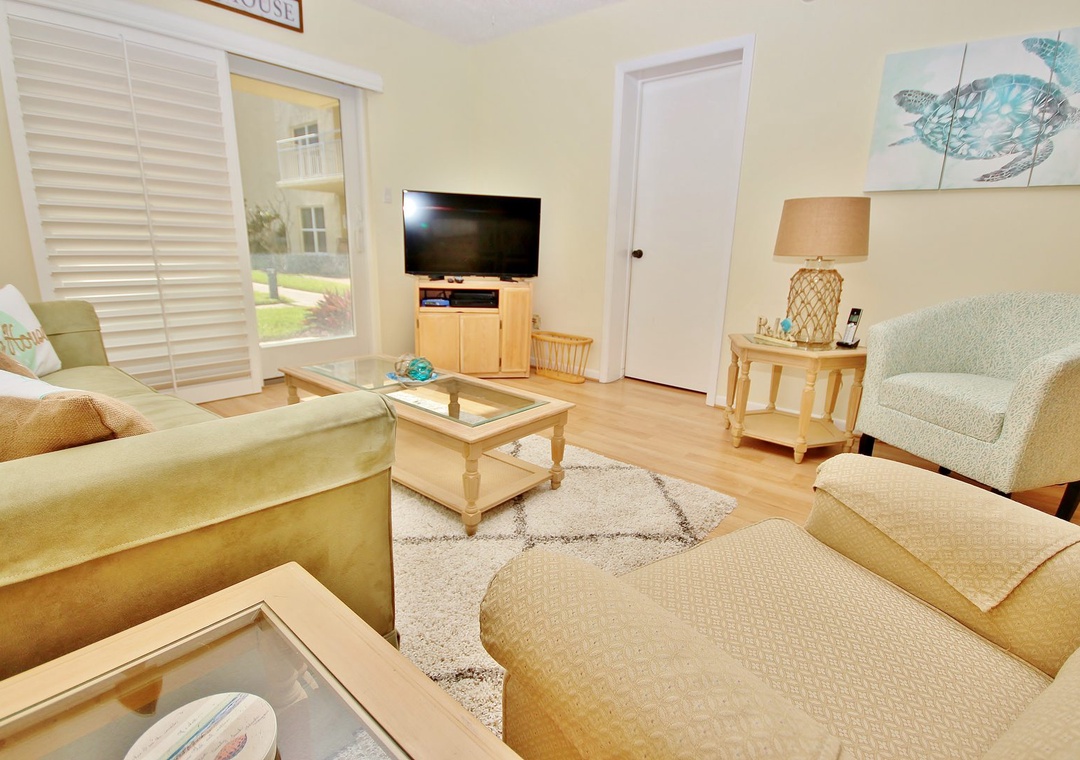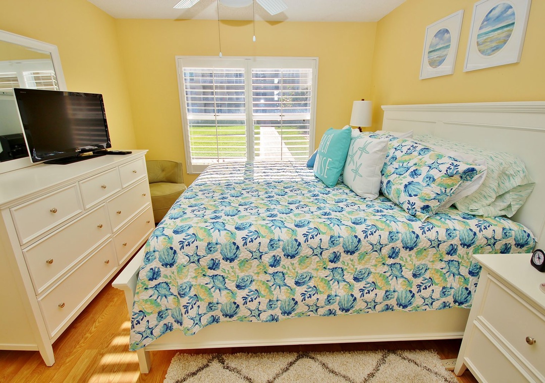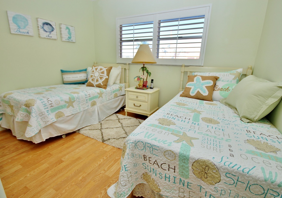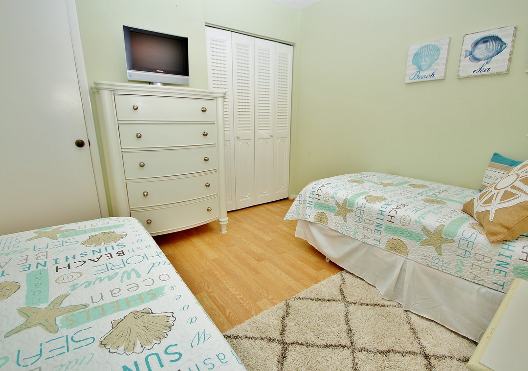 At Sea Coast Gardens II 114, you will find a large master bedroom with a giant window, so you can experience the Floridian sunshine. The room also offers a ceiling fan and a flat-screen TV for late-night viewing. Guests staying in the master bedroom have easy access to a bathroom with walk-in shower and large vanity. You'll have plenty of room to get ready for a day of fun in New Smyrna Beach. The second bedroom is outfitted with two twin beds. Both bedrooms provide plenty of storage space for your clothes.