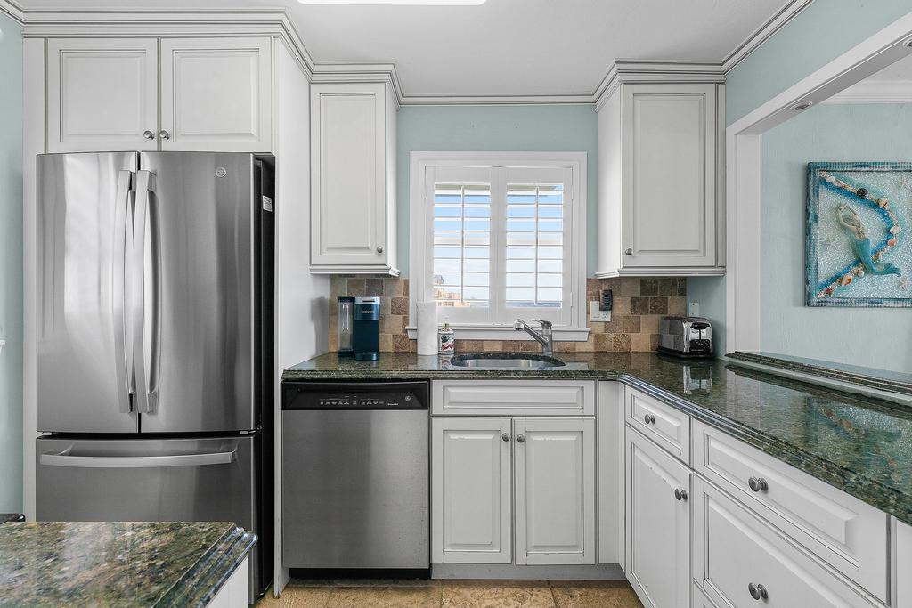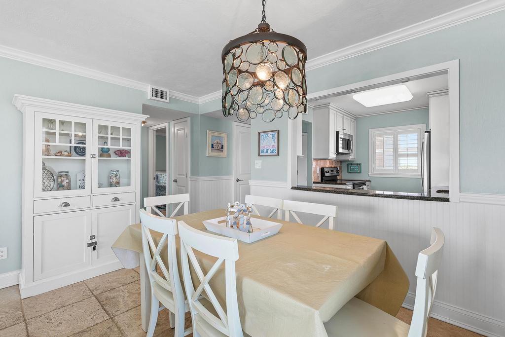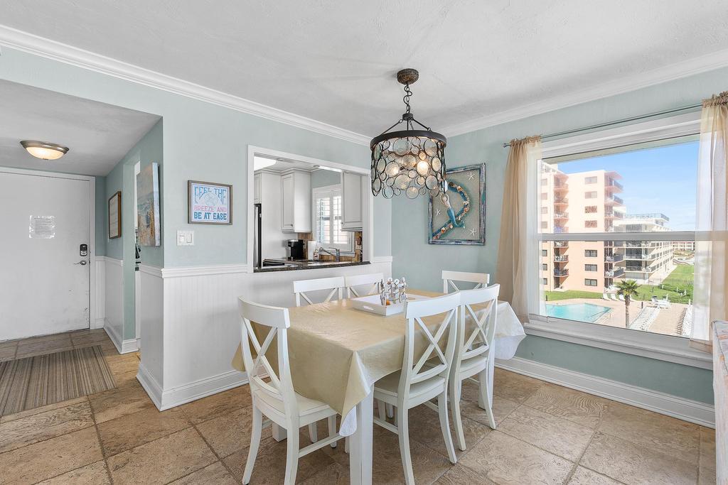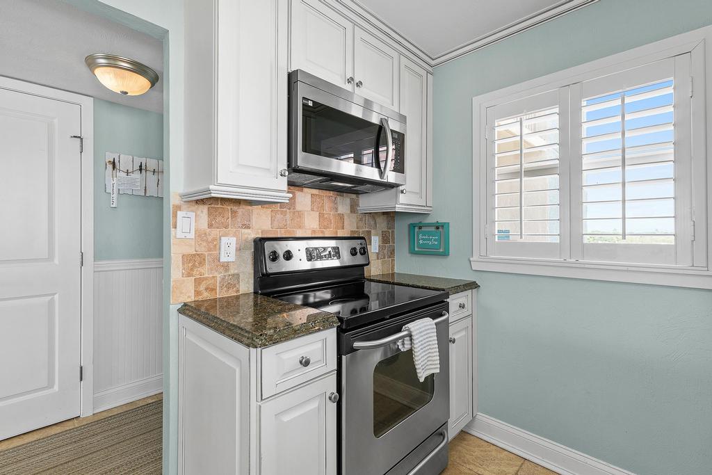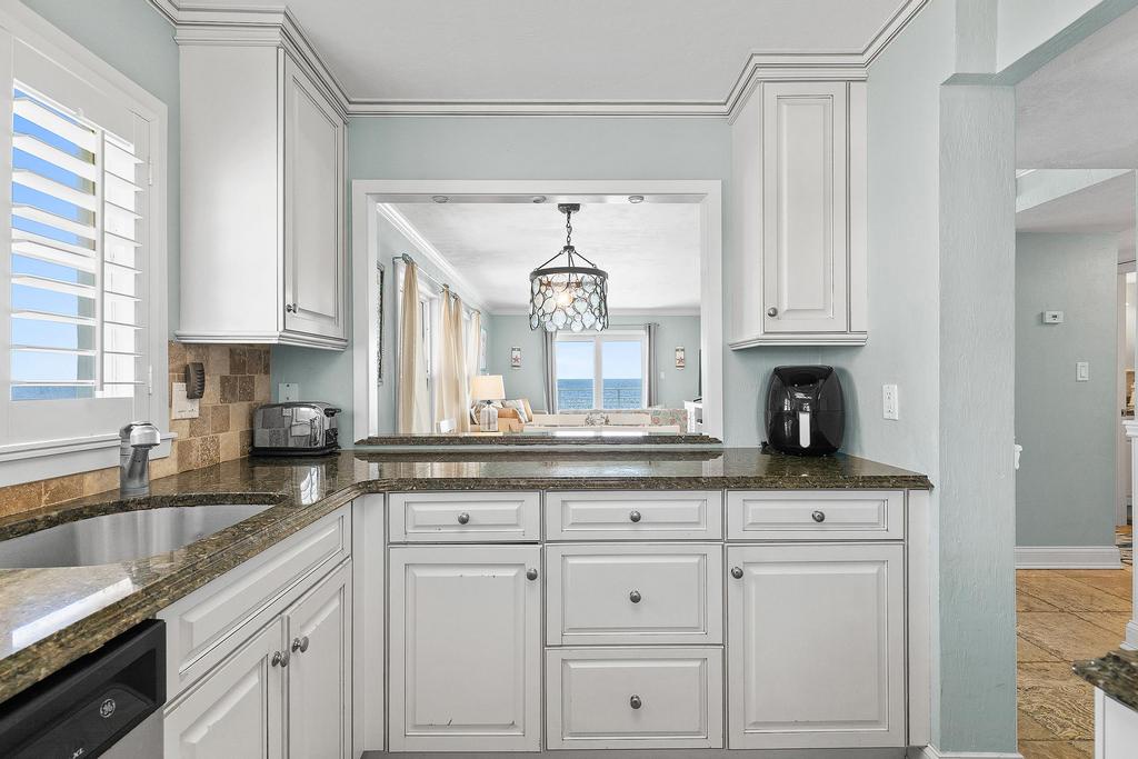 While New Smyrna Beach is filled with plenty of amazing restaurants, you'll love the occasional evening in making a home-cooked meal. The kitchen has granite countertops, white cabinetry, stainless steel appliances, and two fantastic views of the shore. This space is not only aesthetically pleasing, but also well-stocked with cooking essentials and a Keurig coffee maker. You and yours can gather for dinner at the nearby table for six.