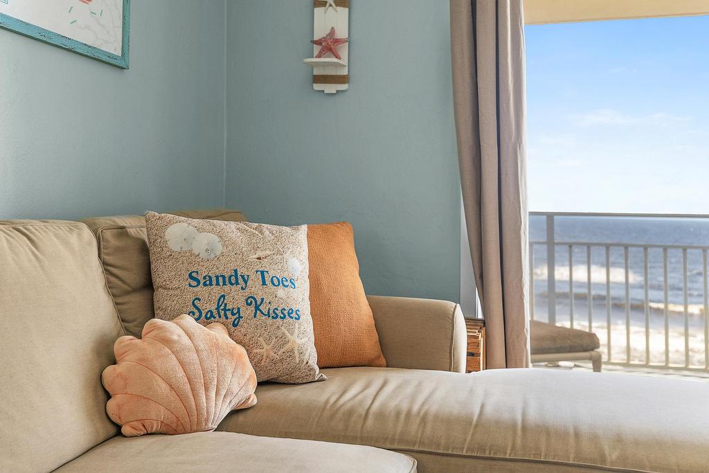 The condo greets vacationers with a jaw-dropping view of the waves. As the condo is a corner unit, you can see miles of sandy beach from nearly every room. Light walls and tile flooring create the perfect contrast to the blue scenery outdoors.