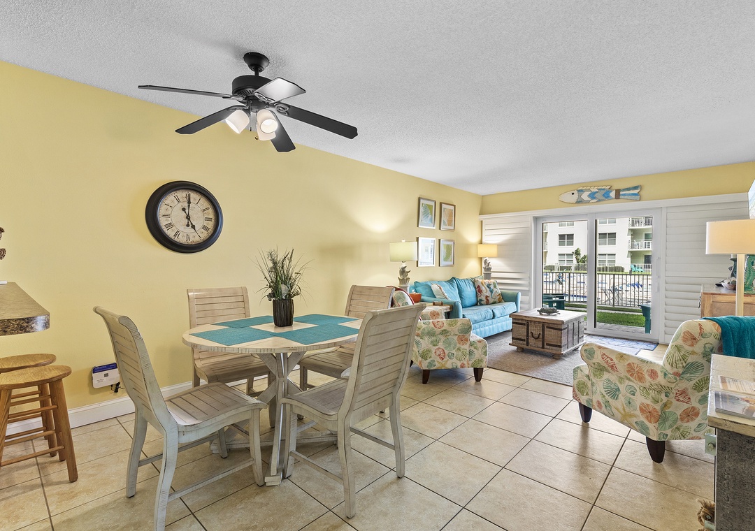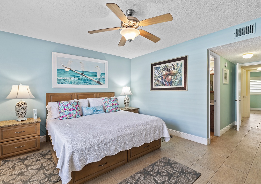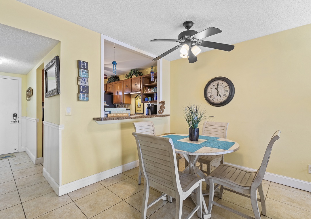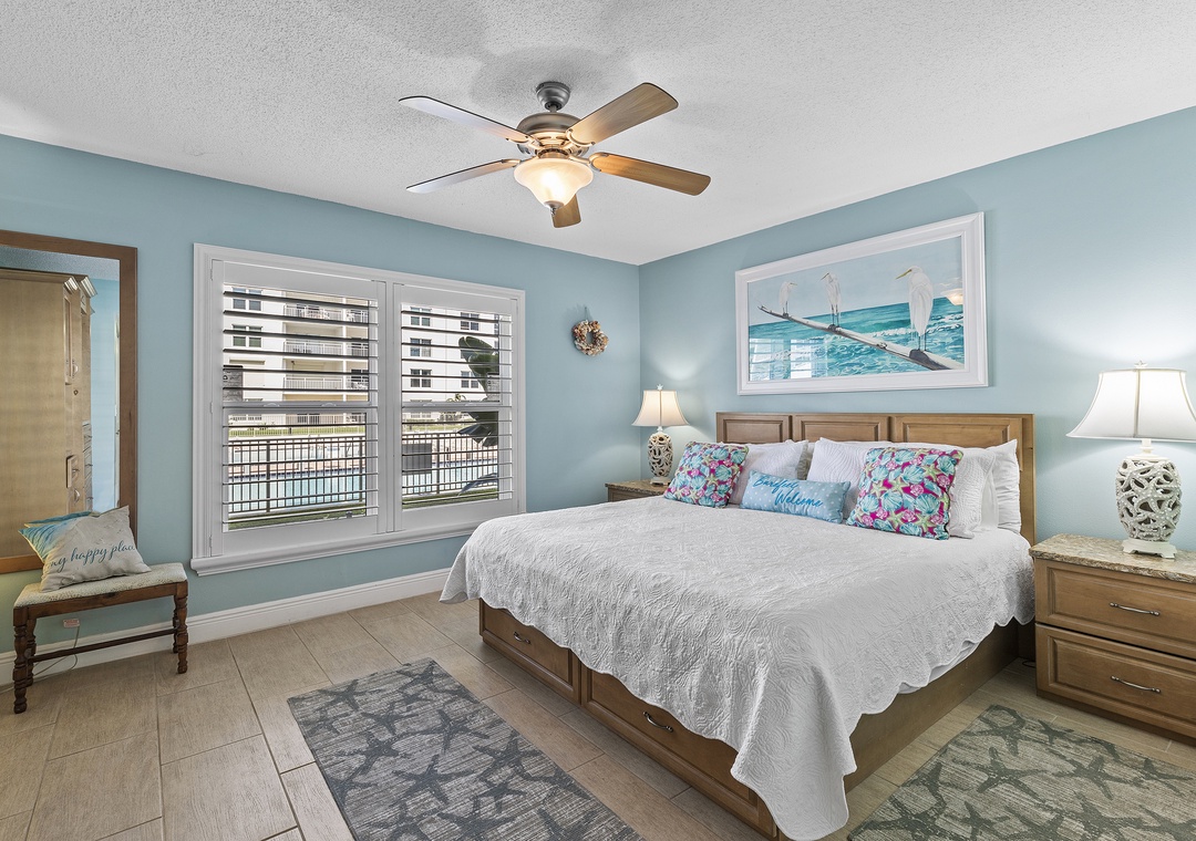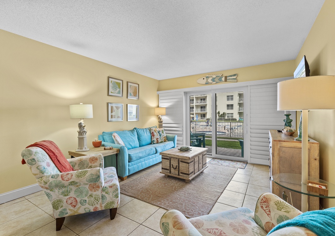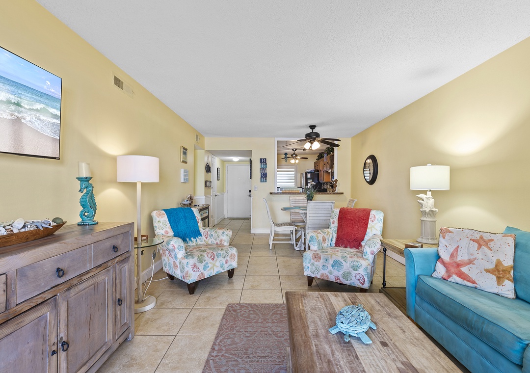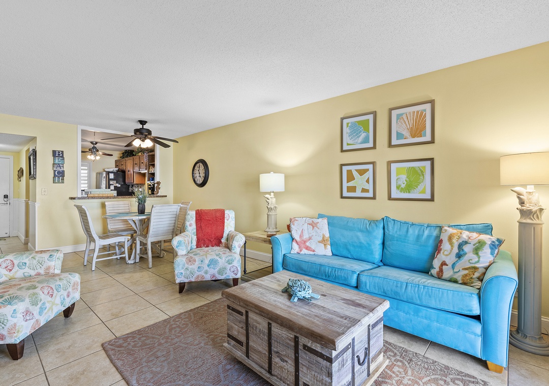 Arrayed in soft yellows and vibrant blues, this condo welcomes guests with a playful beachy atmosphere that whispers of relaxation and long lazy days. From large, ceramic tile flooring to white, plantation shutters, you'll find your stay filled with refined features and eclectic, coastal charm.