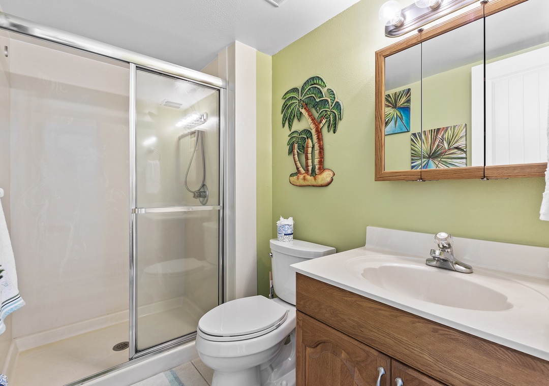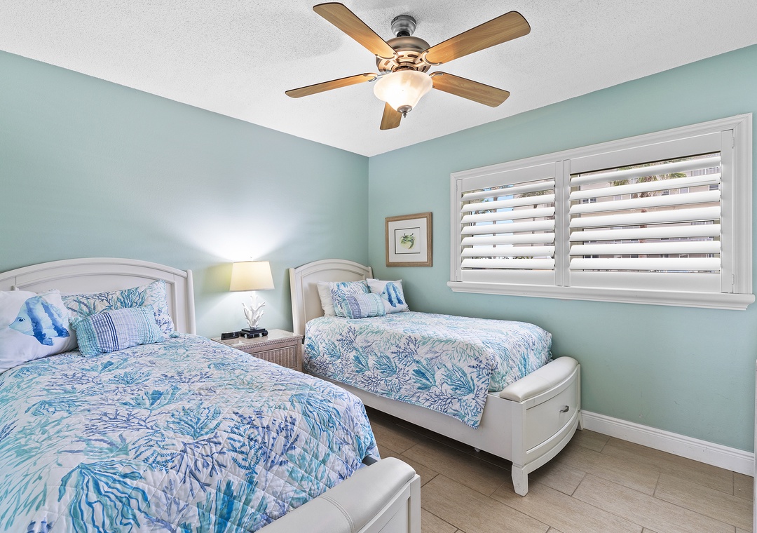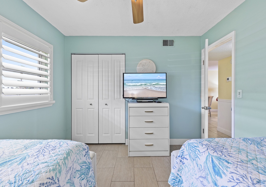You won't be the only one catching up on R&R in an airy atmosphere; the others in your family will find the guest bedroom to be equally as dreamy. The guest bedroom provides two luxuriously soft twin beds, soft coastal décor, and a flat-screen TV atop a white dresser. The nearby bathroom has a standard, glass-enclosed bathtub, upgraded vanity, large mirror, and lots of bath towels.