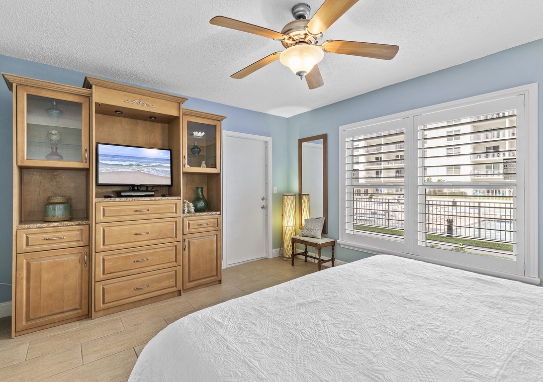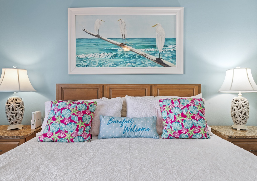 After the sun sets, retreat to the master suite that you've secretly looked forward to all day. This bedroom enchants guests with its soothing bright blue tones and white accents that create a dreamy, coastal getaway. You'll love how the wonderfully soft, king bed is perfectly situated between the window looking onto the pool and the flat-screen TV nestled within the armoire. The en-suite master bathroom is decorated with a tropical theme and provides a walk-in, sliding glass shower and plenty of bath linens.