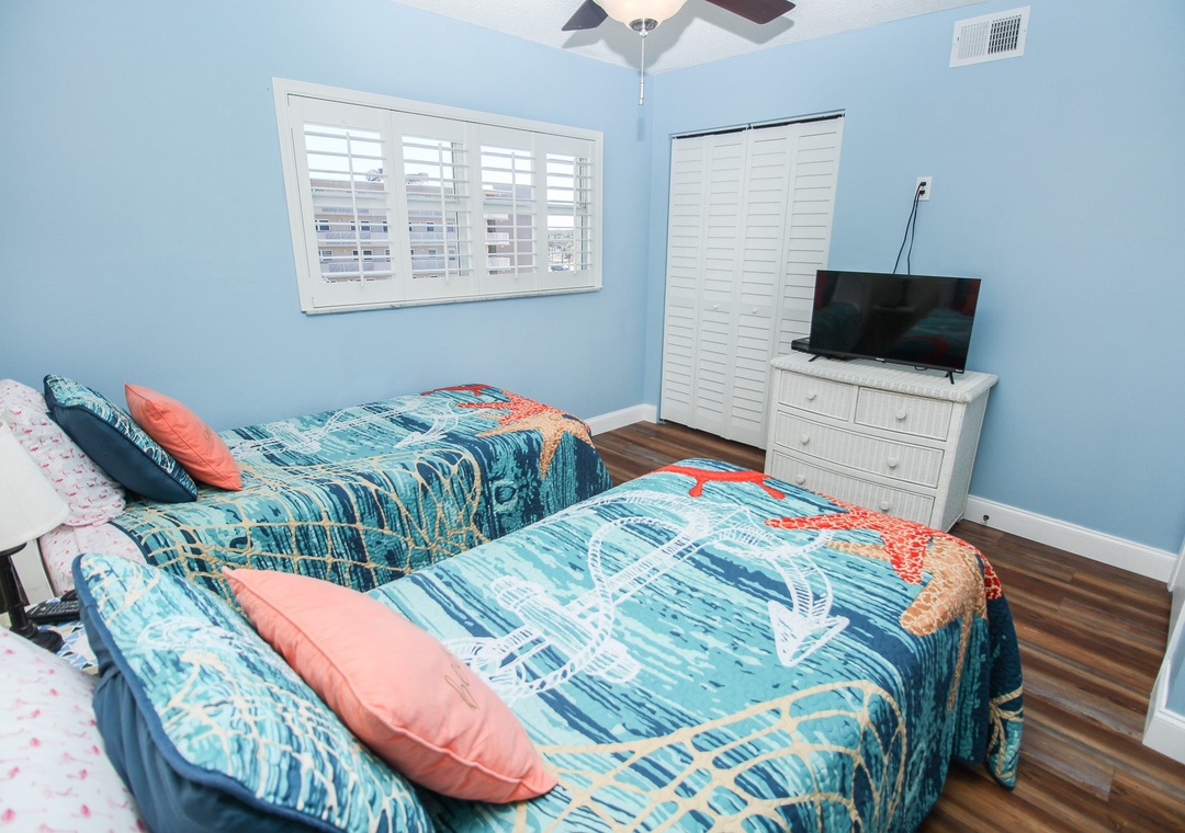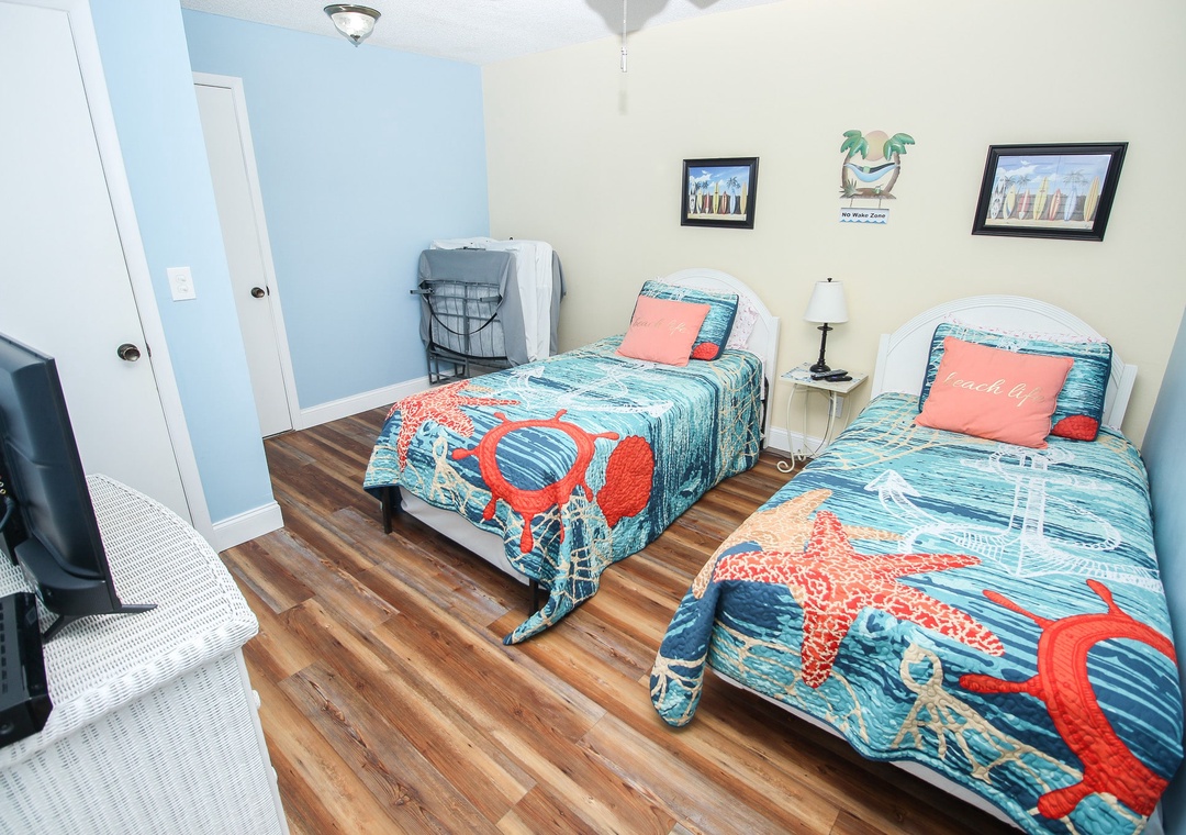 Up to three guests can comfortably share the guest bedroom. Two twin beds and a trundle make this an ideal space for the kids. Similar to the master suite, a flat-screen TV and plenty of dresser space are provided. The guest bathroom has a standard bathtub and plenty of bath linens.