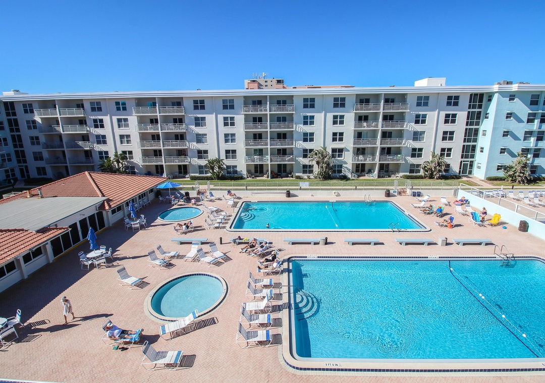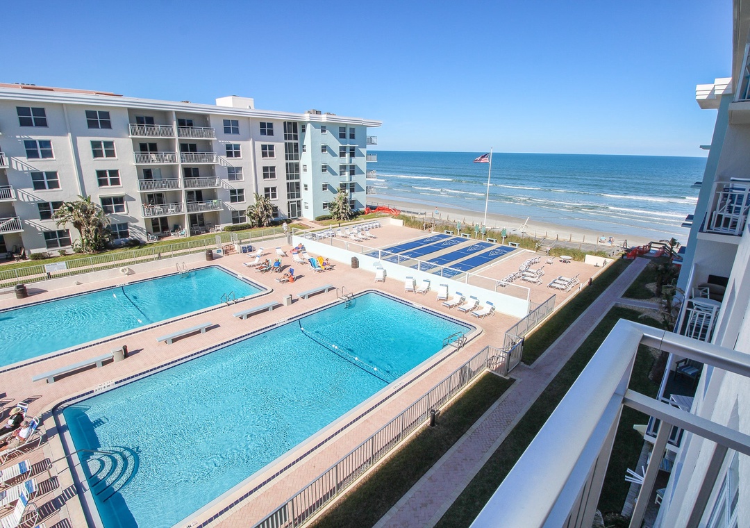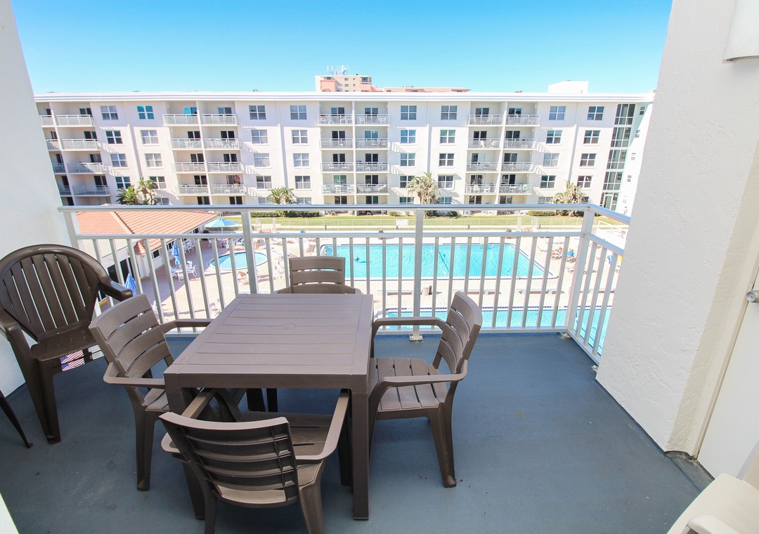 Before the sky fades to night, step out onto the fourth floor balcony to say goodnight to your favorite view. The balcony not only has a view of the crashing waves, but also looks onto the two Olympic-sized swimming pools, shuffleboard courts, and complex grounds. Kick back in one of the provided chairs and end the day listening to the white noise of the ocean.
