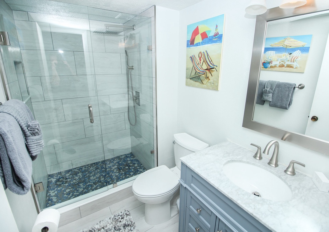 When your eyes grow heavy, say your good nights and retire to the master bedroom. Arrayed in sea blues and wicker accents, this bedroom has a light cottage-like feel that you'll be smitten with. A king bed, accent chair, and flat-screen TV are provided. The bathroom is located nearby and accommodates with a sliding glass walk-in shower and granite-top vanity.