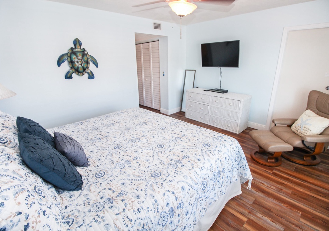 The condo is equipped with plenty of linens, towels, and all the conveniences of home to make your stay comfortable. There is wireless internet, cable TV, a sleeper sofa, a drip coffee maker, beach chairs, and a designated parking space.