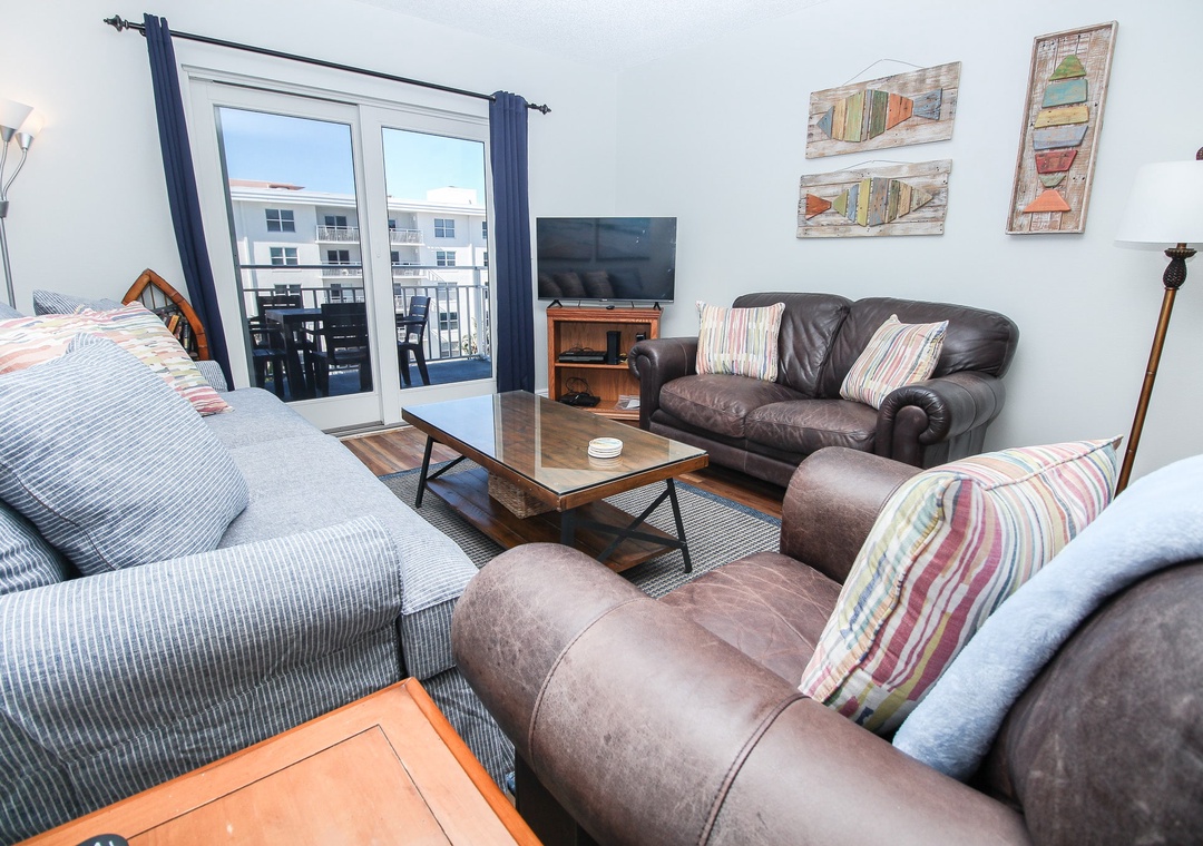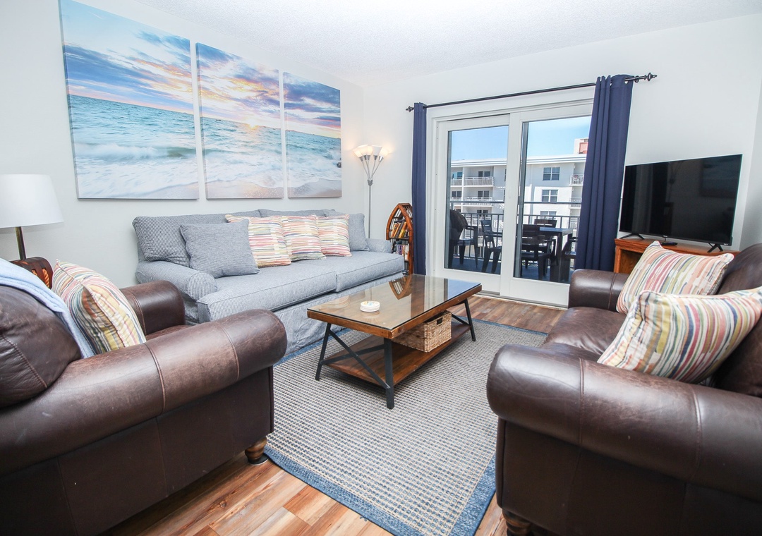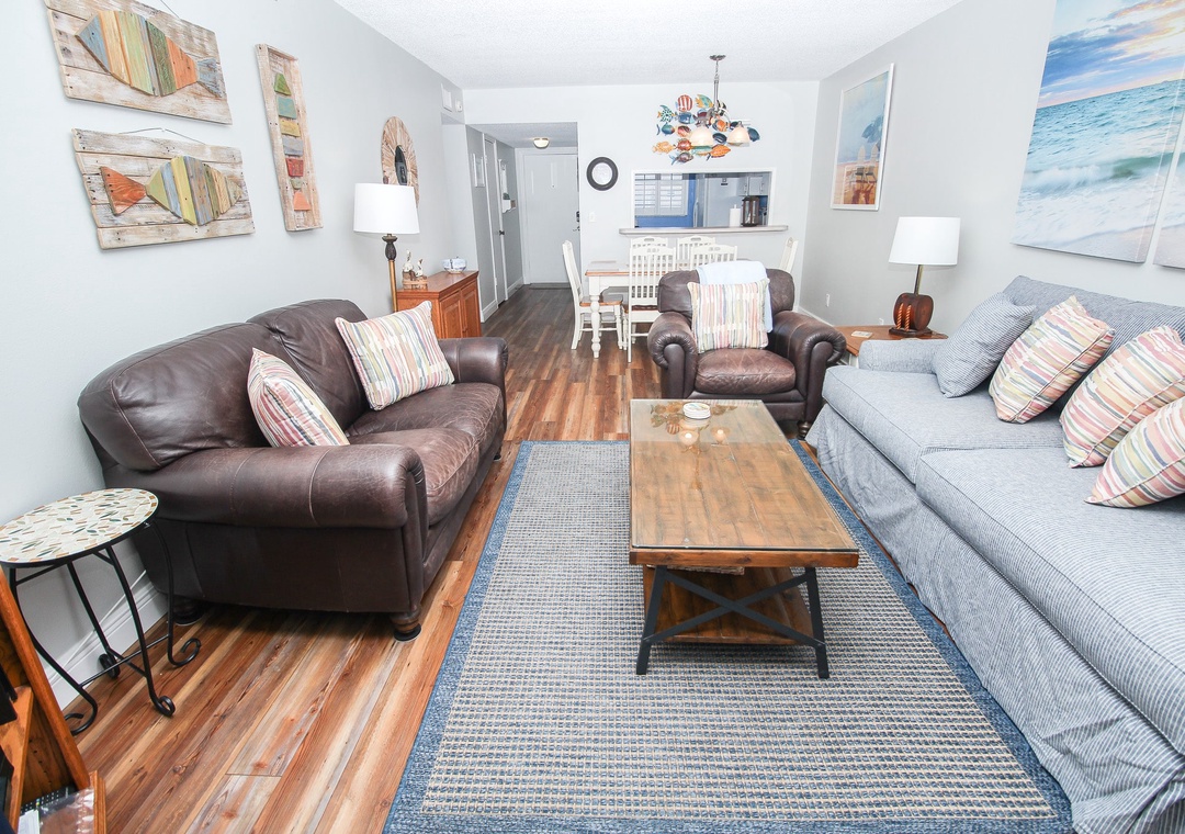 Though most evenings will be spent walking on the beach, you'll love the cozy alternative of relaxing in the living room. The living area has a sleeper sofa and a leather loveseat and chair. Snack on popcorn and watch your favorite shows on the flat-screen TV that's equipped with cable and a DVD player.