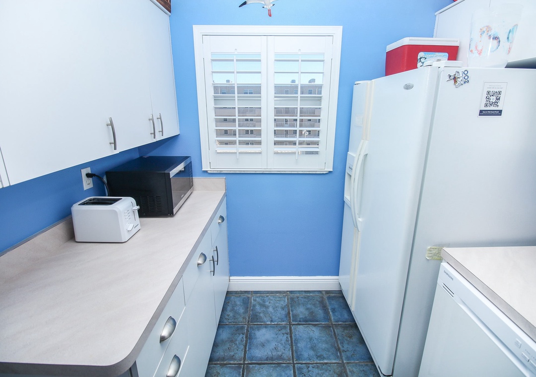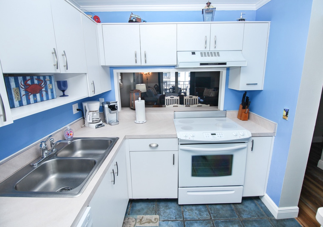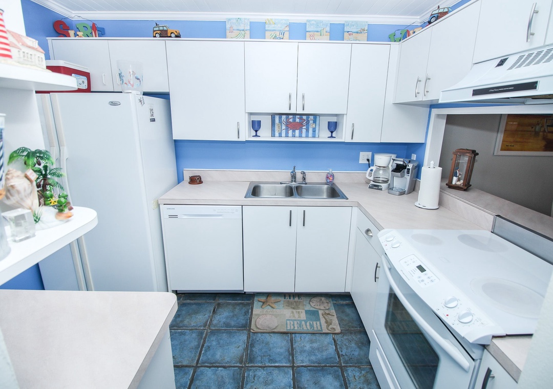 Golden walls and honey-toned wood flooring give this space a warm, home-like appeal. Begin settling into your beach retreat by putting your groceries away in the cheery kitchen. This area is arrayed in seaside hues from the bright blue walls to the chic white cabinetry and appliances. If cooking doesn't take you out of vacation mode, you'll find yourself opting to stay in and make your favorite meals. Pots and pans, cooking utensils, a kettle, drip coffee maker, toaster, and more are provided to make meal prep a breeze.