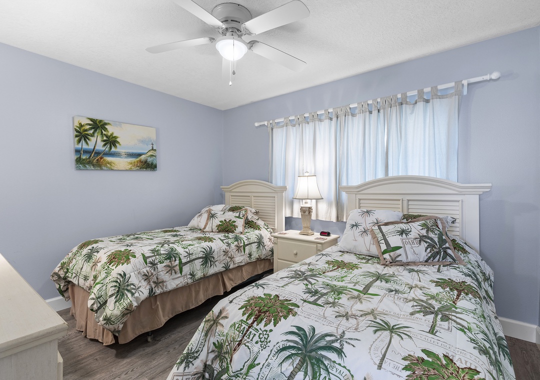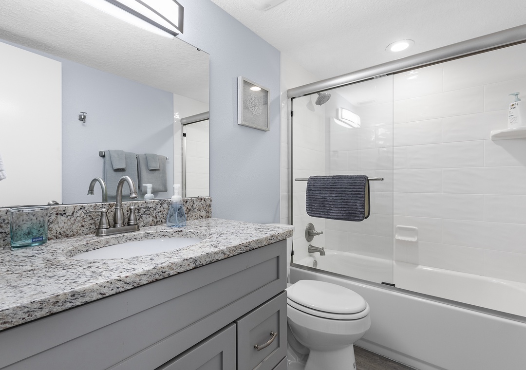 Two others in your group can claim the second bedroom which holds two twin beds and a dresser. Guests can use the nearby bathroom which has a sliding glass door bathtub, a granite-top vanity, and bath towels.