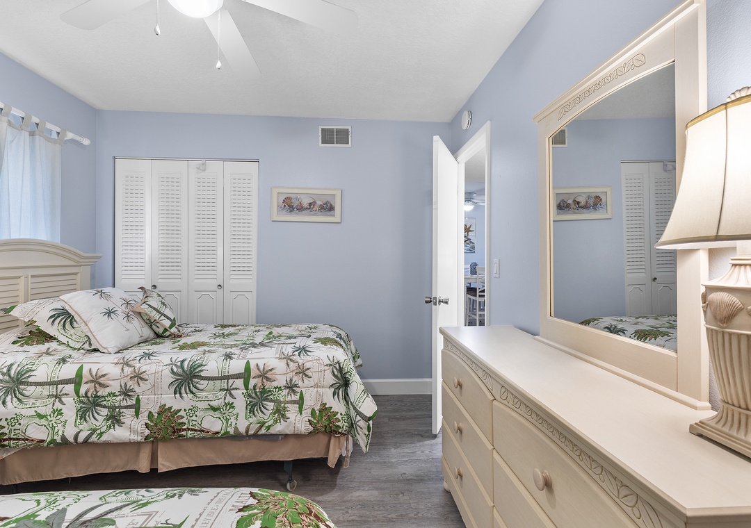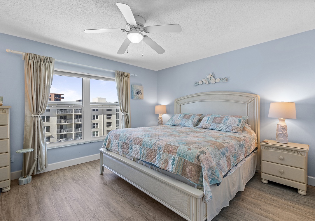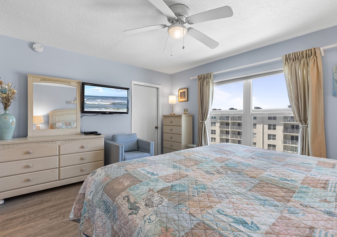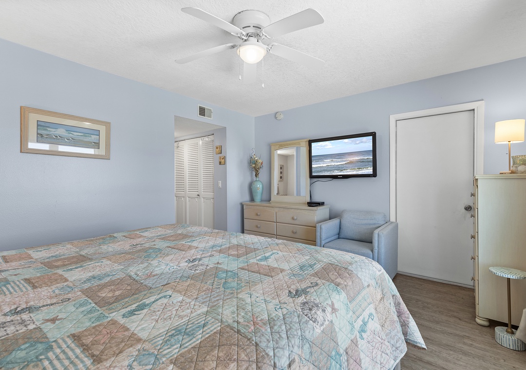 At the end of each fun-filled day, you'll be excited to retreat to the primary bedroom. Along with a king bed and mounted TV, this bedroom provides guests with a glimpse of the blue water horizon. There's also an adjoining bathroom with a sliding glass door shower and granite-top vanity.