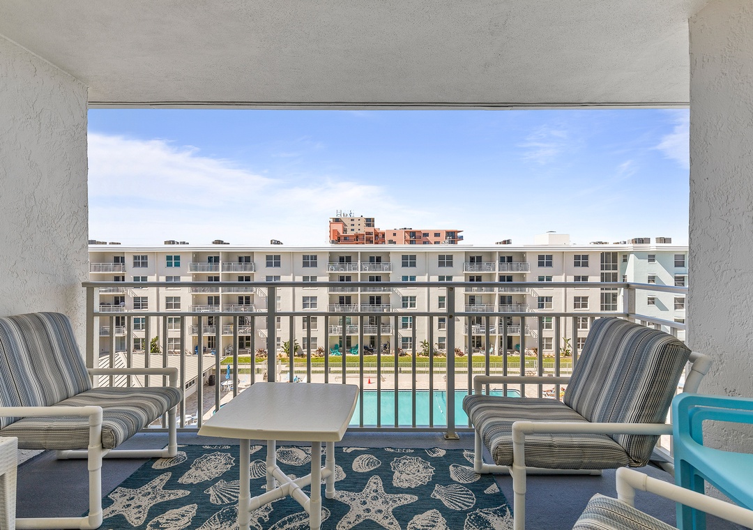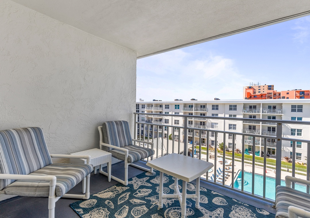 If you can't get enough of the ocean scenery, take your relaxation outside to the balcony. The 5th floor balcony has a fantastic view of the ocean, clear shore, and pools below. We recommend visiting this spot in the morning so you can enjoy your coffee to the sight of the ocean sunrise!