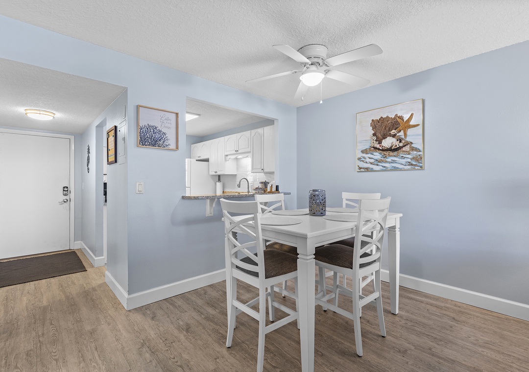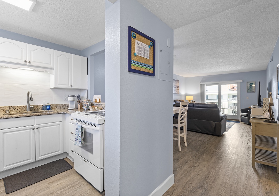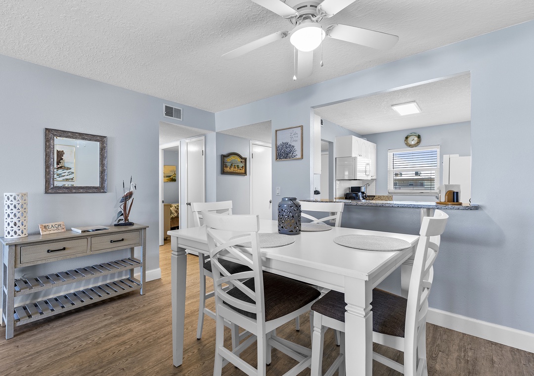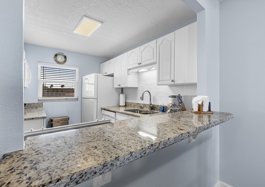 The condo's blue and grey accents usher guests into relaxation mode as they walk in. Before you head to the pool below, grab a quick bite in the updated kitchen. This space features white cabinetry, granite countertops, white appliances, a Keurig coffee maker, and all the cooking essentials you should need. Just beyond the pass-through window is a dining room table that comfortably seats six.