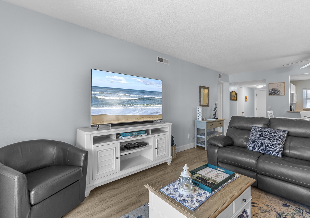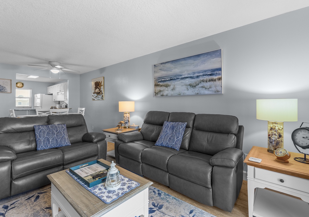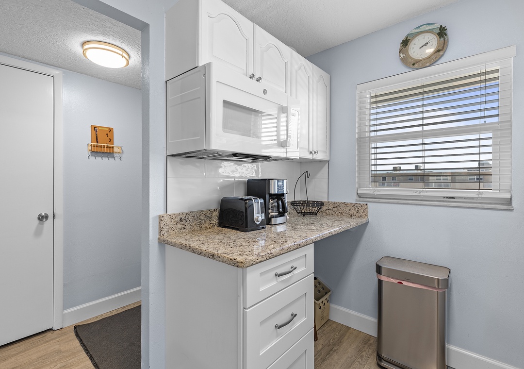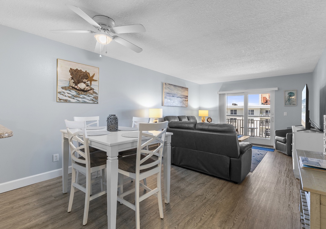 The condo's blue and grey accents usher guests into relaxation mode as they walk in. Before you head to the pool below, grab a quick bite in the updated kitchen. This space features white cabinetry, granite countertops, white appliances, a Keurig coffee maker, and all the cooking essentials you should need. Just beyond the pass-through window is a dining room table that comfortably seats six.